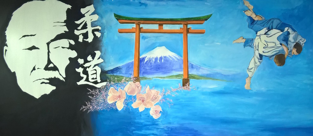 L’artiste-peintre frettois Pierre-Yves BOUGUET a réalisé, pour le club, une fresque représentant les différents symboles du JUDO : Jigoro KANO (le fondateur), le Fuji-Yama (la montagne sacrée), un Torii (porte d’entrée d’un sanctuaire), Sakura (fleurs de cerisier) qui est aussi l’insigne du Kodokan (première école de Judo fondée par Me KANO en 1882).